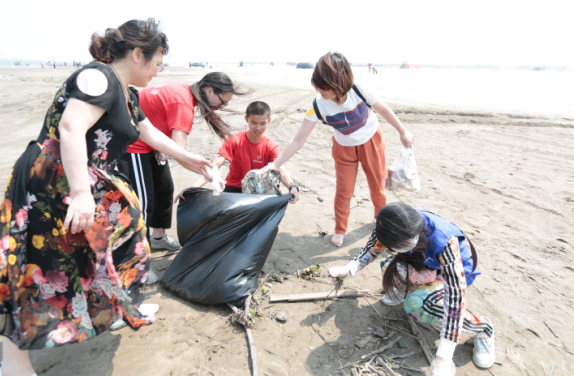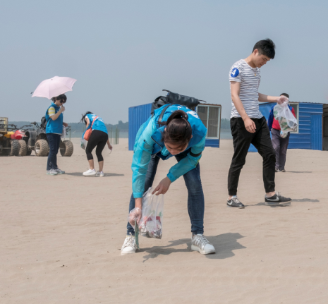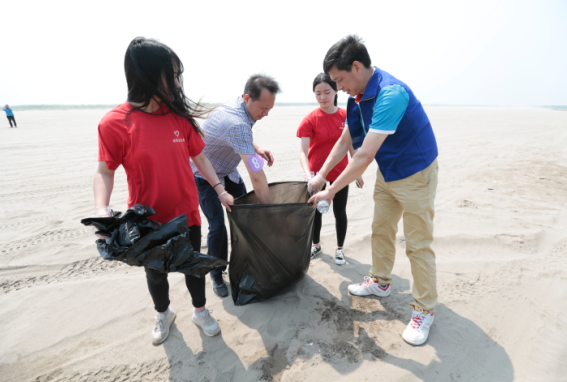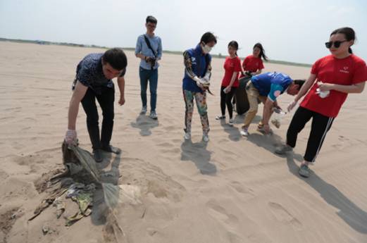离开福利院后,师生志愿者们一行驱车来到君山银沙滩开展关爱自然——保护生态自然环境清洁沙滩活动。烈日下,大风卷起的沙尘,丝毫没有让志愿者们退缩。有的单独行动,有的分工协作,在长达1个多小时里的清洁行动中,志愿者们在主沙滩上收集了满满的六大袋垃圾。