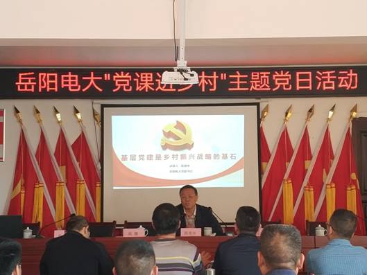 岳阳电大党委书记陈美中教授深入浅出、生动活沷讲了一堂题为《加强基层建党,助推乡村振兴》党课。对于农村基层建党工作:一是加强农村基层党建,实现乡村振兴,光荣的使命就在我们肩上;二是加强农村基层党建,实现乡村振兴,沉重的话题就在我们心上;三是加强农村基层党建,实现乡村振兴,践行的水平就在我们手上。分析了现阶段农村基层党建工作存在的问题:经济基础弱、队伍配备难、先锋意识差、活动开展少、制度建设空、发展方略缺。提出了乡村振兴的基本发展思路,即要把党的建设作为首要地位,要把经济建设作为战略中心,要把文化建设作为重要抓手,要把生态建设作为基础工程。
