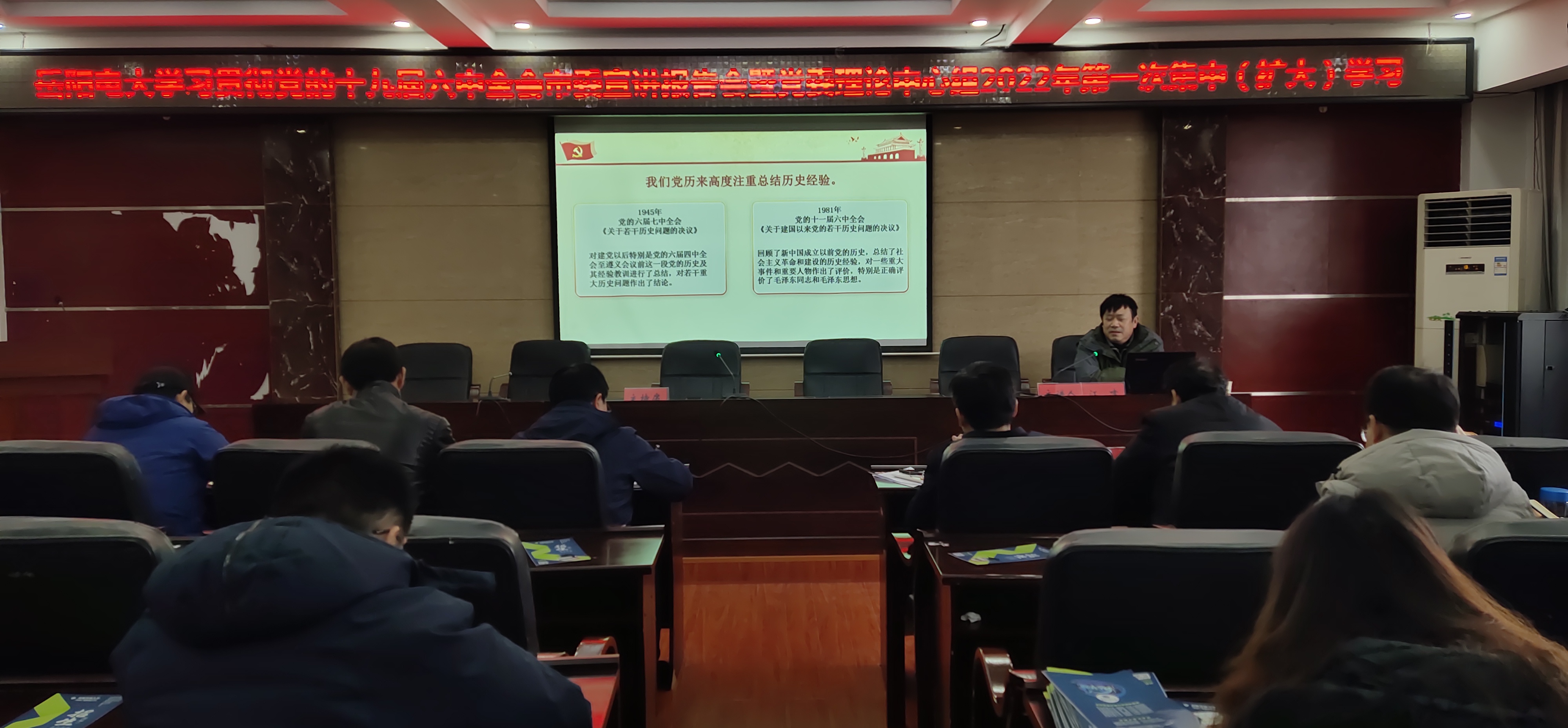 1月6日下午,我校举办党的十九届六中全会精神专题宣讲会,邀请市委理论宣讲团成员、市委宣传部理论科长江哮作专题宣讲。岳阳电大全体教职员工及校党委行政班子成员参加专题宣讲会。会议由岳阳电大党委书记李有根主持。