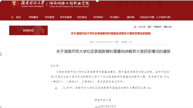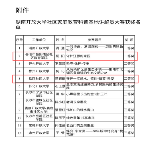 6月8日,湖南开放大学社区家庭教育科普基地讲解员大赛结果正式公布。由岳阳开放大学(岳阳社区大学)选送、制作的《守护江豚的家园》、《守护一江碧水,留住“微笑”天使》视频作品从全省14个地市州24个参赛作品中脱颖而出,分别荣获全省一等奖、二等奖。其中,由岳阳社区大学岳阳楼区社区学院报送的《守护江豚的家园》被省开放大学推送至湖南省首届社科普及基地讲解员大赛继续角逐。