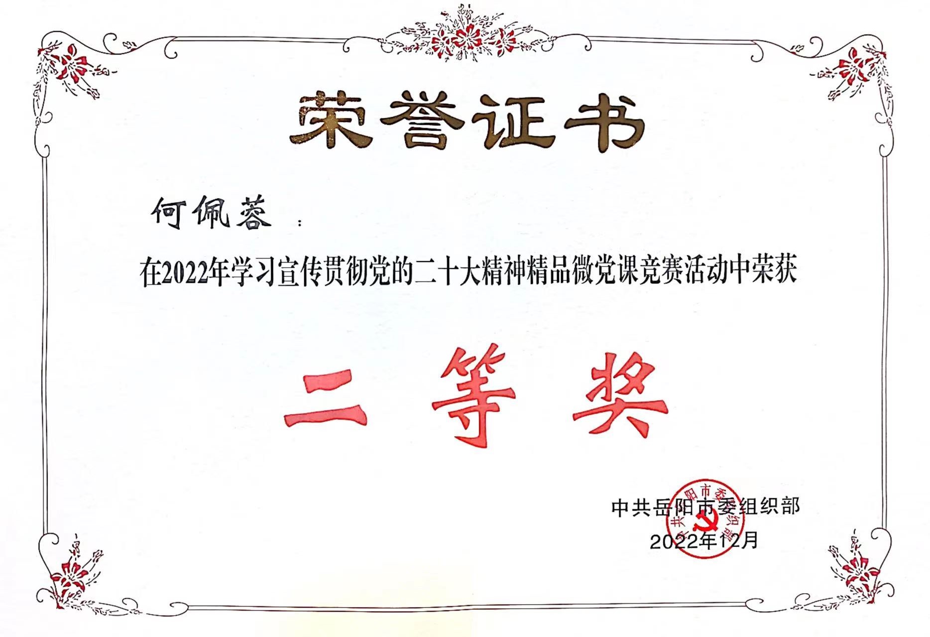 喜报!我校何佩蓉老师在市委组织部举办的学习宣传贯彻党的二十大精神精品微党课竞赛中荣获二等奖