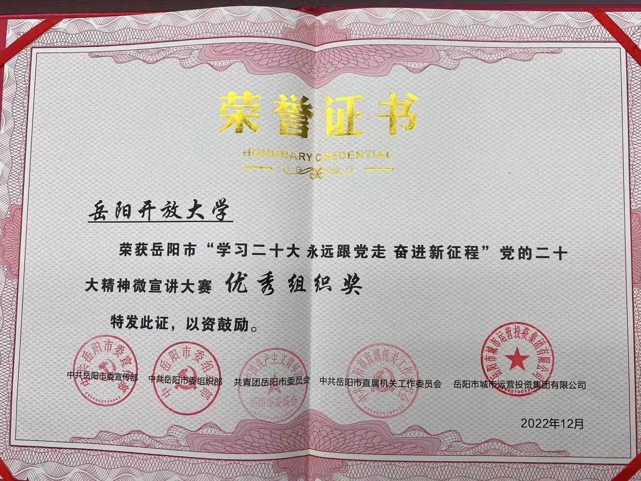 12月8日,由中共岳阳市委宣传部、中共岳阳市委组织部、共青团岳阳市委员会、中共岳阳市属机关工作委员会、岳阳市城市运营投资集团有限公司联合举办的“学习二十大 永远跟党走 奋进新征程”党的二十大精神微宣讲大赛决赛落下帷幕。我校获优秀组织奖,青年教师杨雨婷、何佩蓉获优秀奖。
