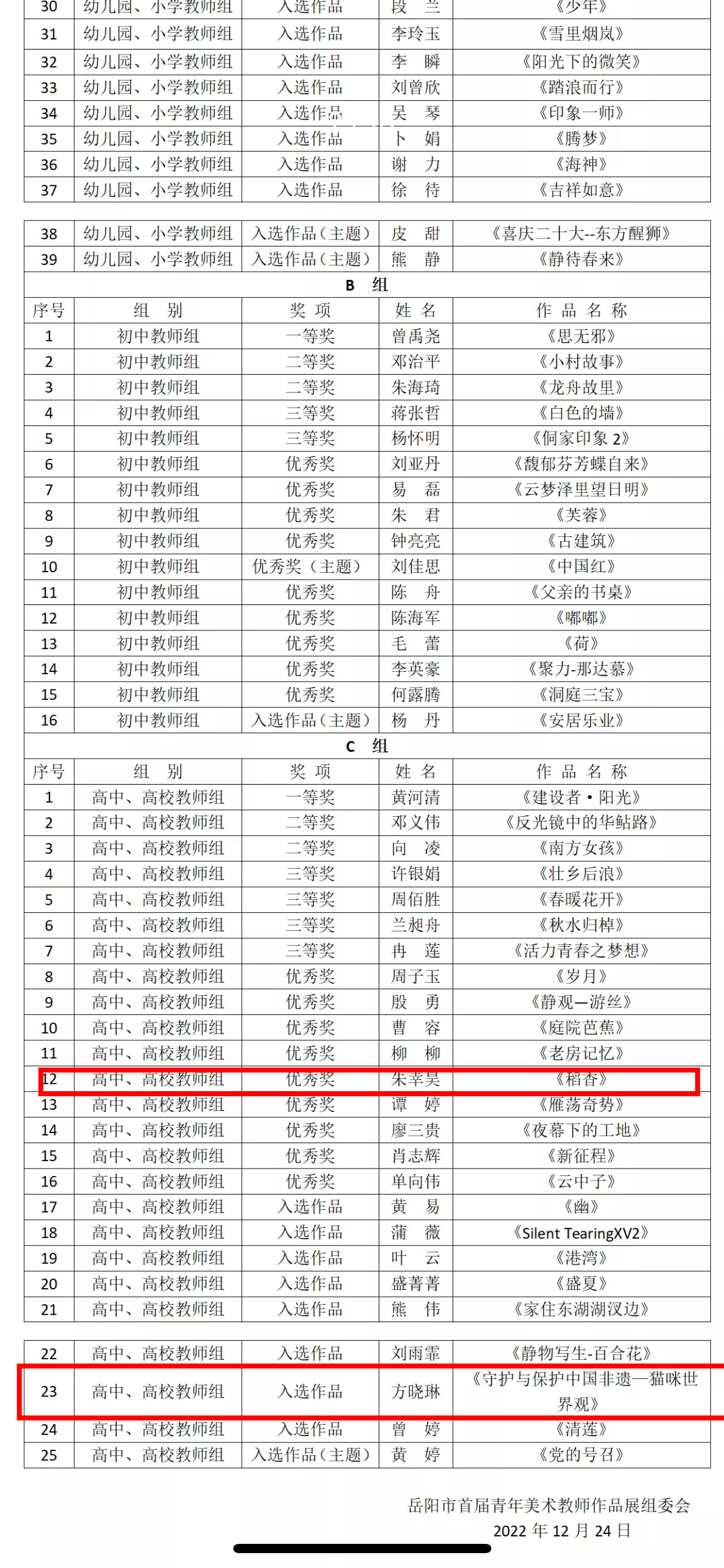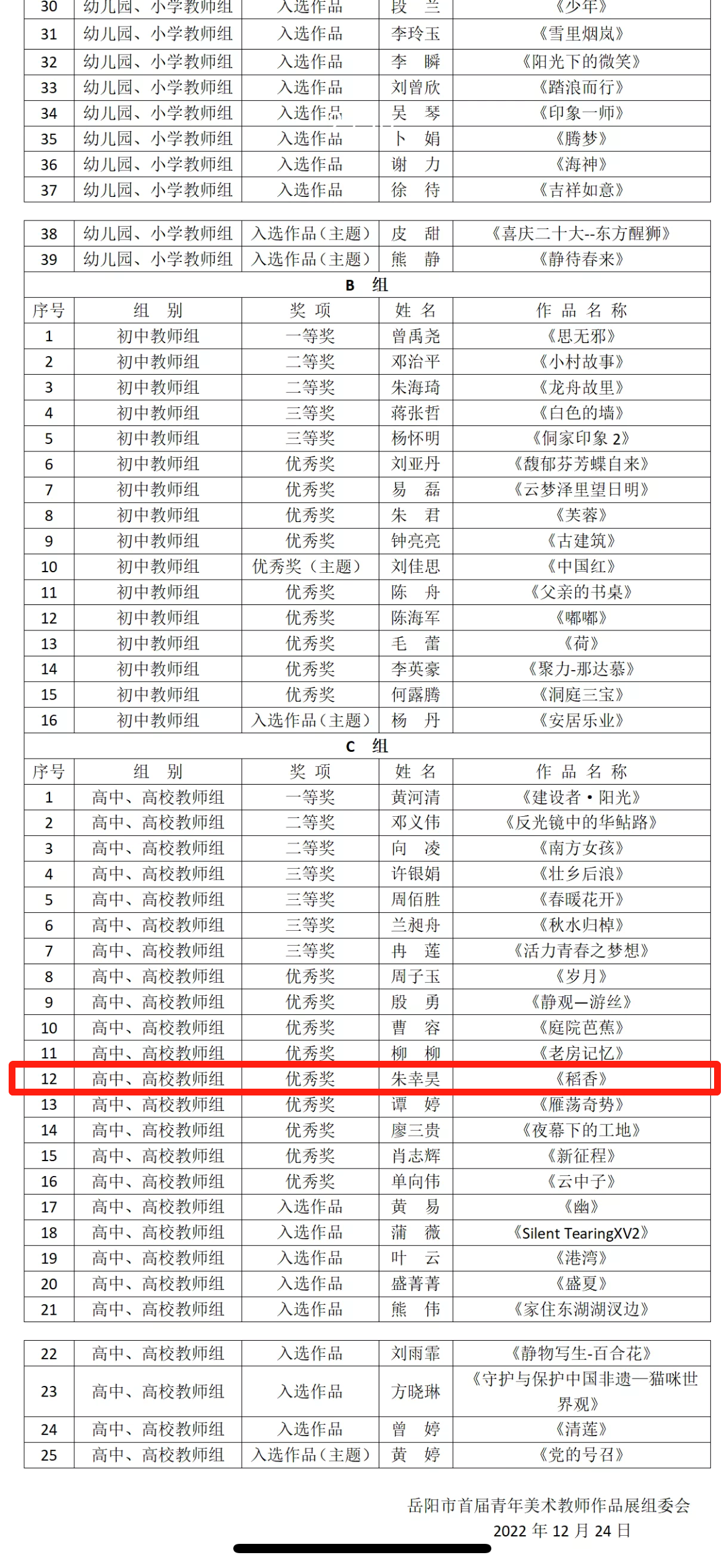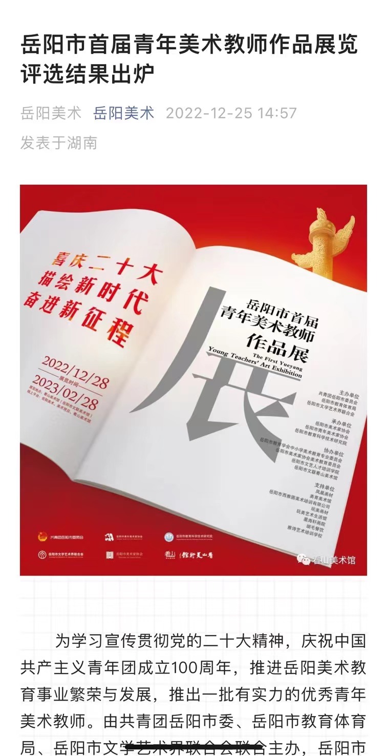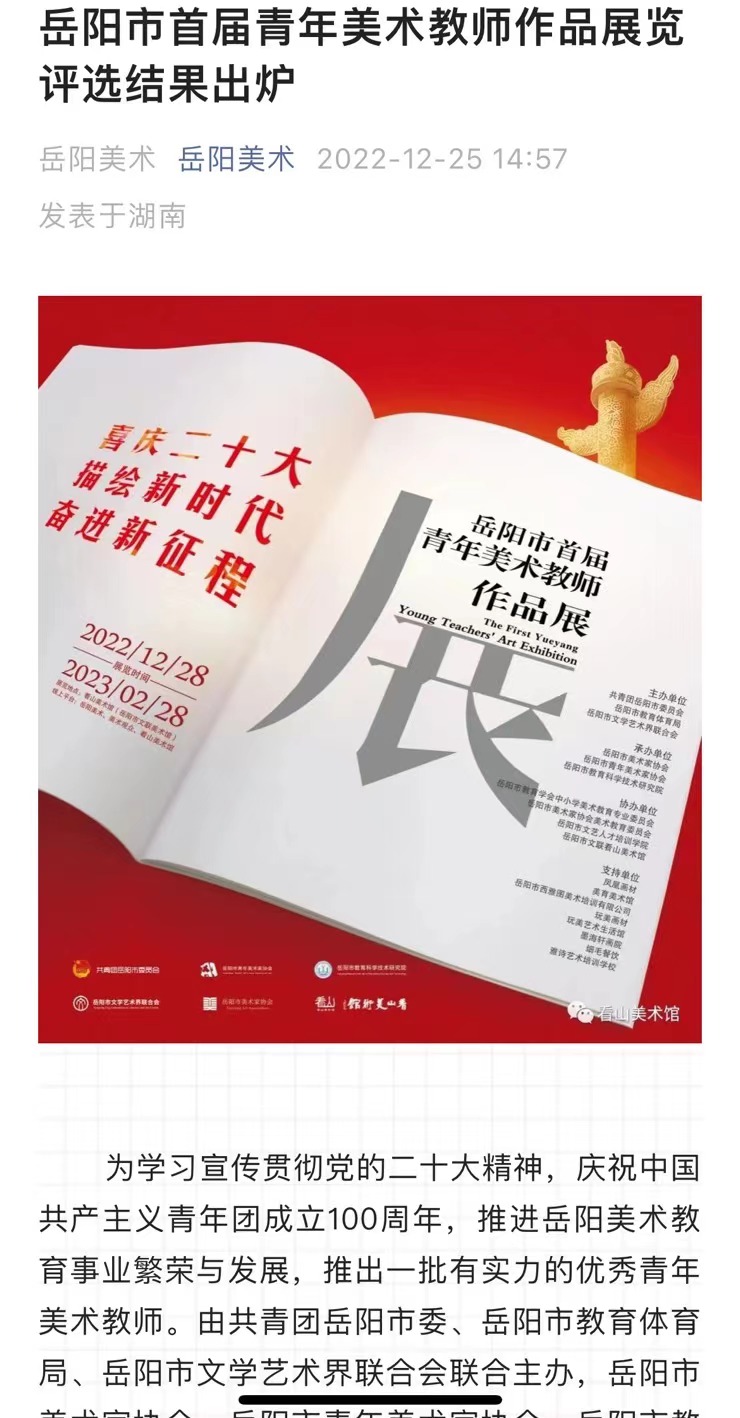 12月25日,岳阳市首届青年美术教师作品展览评选结果出炉。我校两位青年美术教师朱幸昊、方晓琳获得入展资格。其中朱幸昊老师的水粉作品《稻香》获得“高中、高校教师组”优秀奖。本次活动由共青团岳阳市委、岳阳市教育体育局、岳阳市文学艺术界联合会联合主办,岳阳市美术家协会、岳阳市青年美术家协会、岳阳市教育科学技术研究院联合承办。